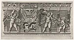 Step into the Renaissance world with *Le Bas Relief aux Trois Am (The Throne of Neptune, a captivating 1519 engraving by Dente. This Italian printmaker, active in early 16th-century Rome masterfully reproduced classical motifs, drawing from antiquity's grandeur during the High Renaissance. Measuring 7 11/16 x 14 3/16 inches, the sheet captures a bas-relief scene featuring Neptune's throne adorned with playful amours—likely cherubic figures symbolizing love and the sea god's domain. Engraving, Dente's chosen medium, was revolutionary for its precision: incised lines on a metal plate held ink, ...