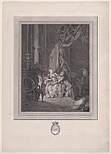 **Le danger du tête-à-t (The Danger of the T-à-Tête)** This intriguing 18th-century print created by French artists Pierre Antoine Baudouin and-Baptiste-Blaise Simonet, captures the tension of a private encounter between men and women. The title, translating to "The Danger of the T-à-Tête," hints at a moralistic warning about the risks of intimate conversations, a common theme in Rococo-era art that blended playful sensuality with social commentary. Baudouin, known for his delicate genre scenes, likely designed the composition, while Simonet contributed to the precise engraving, resulting i...