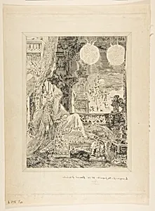 **Le Songe d'un habitant du Mogol (The Dream of a Mughal Inhabitant), 1886** This captivating etching, the first state of seven, showcases a collaboration between master printmaker Félix Bracquemond and Symbolist painter Gustave Moreau, published by the luxury firm Boussod, Valadon & Co. Likely inspired by Jean de La Fontaine's fanciful tales, the title evokes an exotic dreamscape from Mughal India, blending French 19th-century artistry with Orientalist imagination. Measuring about 15 by 11 inches, its intricate plate captures architecture and male figures in a visionary haze, characteristic ...