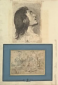 Leaf from Aedes Walpolianae mounted with a print and a drawing (a): Head in Profile of Prodigal Son; (b): The Wagonner (after Peter Paul Rubens) in Jean-Paul Mariette mount