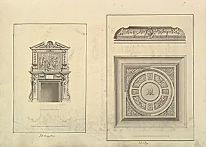 Leaf from Aedes Walpolianae mounted with two drawings: (a): Hall Chimney-Piece, Houghton Hall, Norfolk; (b): Hall Ceiling, Houghton Hall, Norfolk