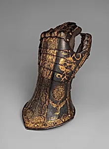 This exquisite left gauntlet, crafted around 1608 by master armorer Jacob Halder at the Royal Almain Armoury in Greenwich, England, once protected the hand of Henry Frederick, Prince of Wales (1594–1612), the beloved eldest son of King James I As heir to the throne, Henry embodied the Renaissance ideal of the warrior-prince, and his armor was designed more for dazzling display in tournaments and courtly pageantry than battlefield combat. Greenwich workshops, under royal patronage since Henry VIII's time, were renowned for producing such opulent pieces, blending English craftsmanship with conti...