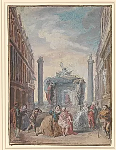**Les fêtes vénitiennes** by Gabriel de Saint-Aubin, created after 1759, captures the exuberant spirit of Venetian festivals in a delicate watercolor and gouache over pen and brown ink. This intimate drawing, measuring just over 8 by 6 inches, depicts lively gatherings of men and women amid the masquerades and revelry for which Venice was famed. Saint-Aubin, a prominent French Rococo artist known for his vivid portrayals of 18th-century social life, brings a Parisian flair to this imagined Italian spectacle, blending precise ink outlines with luminous washes for a sense of movement and festivi...