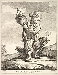 Little boy holding a vessel, from "Premier Livre de Figures d'après les porcelaines de la Manufacture Royale de France, inventées en 1757, par Mr. Boucher" (First Book of Figures after porcelains from the Manufacture Royale de France, devised in 1757, by Mr. Boucher)