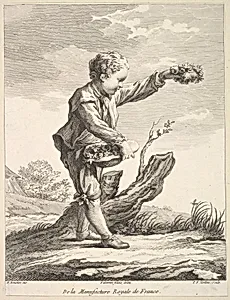 Little boy holding a wreath and basket of flowers, from Deuxième Livre de Figures d'après les porcelaines de la Manufacture Royale de France (Second Book of Figures after porcelains from the Manufacture Royale de France)