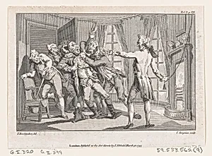 Lord Oxmington Repelling Lismahago's Challenge to Single Combat, an illustration from Tobias Smollett's "The Expedition of Humphry Clinker" (London, 1793), Vol. 1