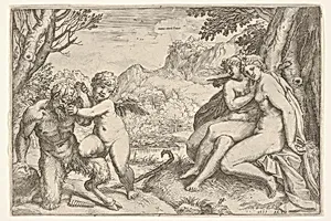 In the spirited engraving *Love Conquers All (Omnia Vincit Amor)* from 1599, Agostino Carracci captures a dynamic mythological tussle. Cupid, the god of love, dominates a leering satyr by pressing right knee firmly on its thigh, symbolizing love's triumph over base desires. At the base of a gnarled tree, two nymphs sit with elegantly interlocking legs, their poised forms adding grace and sensuality to the scene. Measuring just 5 x 7 7/16 inches, this intimate print invites close viewing. Agostino Carracci, a master engraver of the Bolognese school alongside his brothers Annibale and Ludovico,...