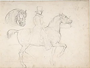 Théodore Géricault *Man on Horseback, Study of Horse's Head is a captivating 19th-century drawing in black chalk, measuring just 8 7/16 x 11 1/8 inches. Housed in the Metropolitan Museum of Art's Department of Drawings and Prints, intimate sheet—bequeathed by Walter C. Baker in1971—showcases Géricault's masterful command of the human and equine form. The composition juxtaposes a dynamic rider astride a powerful horse with a detailed close-up study of the animal's head, highlighting the artist's keen observation of anatomy and movement. As a leading figure in French Romanticism, Géricault was ...
