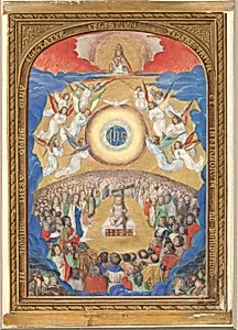 This exquisite manuscript leaf, created by the renowned South Netherlandish illuminator Simon Bening after 153, comes from a Book of Hours—a personal prayer book cherished by devout laypeople during the late medieval and Renaissance periods. Titled *Adoration of the Holy*, it captures a moment of celestial reverence, featuring angels, Christ, and doves gathered around the sacred monogram "IHS," symbolizing. Bening, a master of the Ghent-Bruges school, celebrated for his intricate miniatures that blended Northern Renaissance realism with luminous detail, making this tiny leaf (just 5 7/8 x 4 3/...