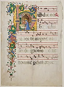 This exquisite manuscript leaf, created by the Master of thecardiana Lactantius the second half of the15th century, hails from an antiphonary—a liturgical book used in Italian churches for chanting antiphons during services. Nestled within a grand initial "H" is a vivid Nativity scene, depicting the Virgin Mary tenderly cradling the infant Jesus, surrounded by the humble ox and donkey in a stable. Such illuminations brought scripture to life for worshippers, many of whom were illiterate, blending devotion with artistry in the transition from Gothic to early Renaissance styles. Crafted with te...