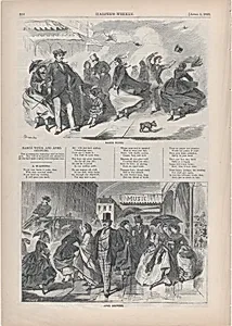 Winslow Homer's *March Winds*, published in *Harper's Weekly* April 2, 1859, captures the raw energy of a blustery spring day. As a young illustrator for the prominent American periodical, Homer contributed vivid wood engravings that brought everyday scenes to life for a national audience. This early work, from Volume III of the magazine, depicts men and women braving fierce winds and rain—likely urban pedestrians caught in nature's sudden fury—highlighting Homer's emerging talent for portraying human resilience amid the elements. Printed as a wood engraving, the image measures 5 7/8 x 9 1/8 ...