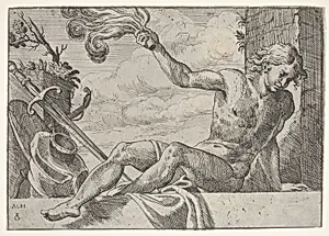 Mars, seated on a wall and holding a flame in his right hand, with armor below
