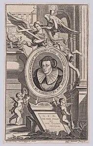 This etching, titled *Mary, Queen of Scots from the Dutch publication *Opgang, voortgang, en nederg, der ketteryen eeuwe* ("Rise, Progress, and Decline of the Heries of This Century"), the tragic 16th-century monarch in a posthumous portrait created over a century after her execution in 1587. Produced in 1690 by a collaborative team including engraver Gaspar Bouttats and designers Hendrik-Frans Verbrug and Florimond de Raemond possible design influence attributed to Mary herself—this print reflects late Baroque ornamental style, enriched by playful putti (cherubic figures) and angels that fram...