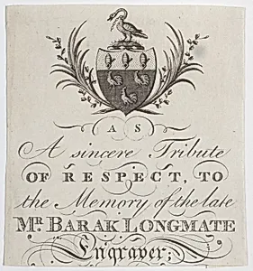 Memorial Card for Mr. Barak Longmate, genealogical editor and heraldic engraver