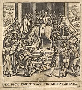 Men collecting dung dropping from the hindquarters of a mule, with a rider sitting backward on the mule and holding its tail aside, surrounded by onlookers spread around a stepped platform, from 'Secular emblems' (Emblemata saecularia)