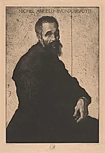 In 1911, Austrian artist Emil Orlik created this striking etching and aquatint titled *angelo Buonarroti*, homage to the Renaissance genius known for masterpieces like the Sistine Chapel and David. Orlik, a master printmaker associated with the Vienna Secession movement, captured Michelangelo's intense visage with remarkable depth and expressiveness. Printed on buff Japanese paper—a nod to Orlik's fascination with uyo-e woodblock techniques—the image measures 57.79 × 39.37 cm, with a larger sheet of 7969 × 57.15 cm, allowing for generous margins that enhance its intimate scale. Etching provid...