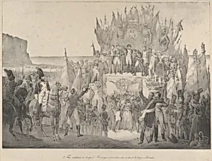 Victor Adam's *Military Festival at Boulogne Napoleon Distributing Stars of the Legion of Honor* captures grand moment of imperial pomp from the Napoleonic era. This 19th-century lithograph depicts Napoleon Bonaparte at the Camp of Boulogne, a massive military encampment established in 1803–1805 as a staging ground for his aborted invasion of England. Surrounded by soldiers on horseback and cheering troops, Napoleon bestows the stars of the Légion d'Honneur—a prestigious order he founded in 1802 to honor military valor and civilian merit—elevating the scene into a symbol of French pride and un...