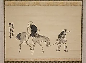 In the serene world of Edo-period Japan (1615–1868), Matsumura Gun captures a whimsical yet profound moment in *Monk Renshō His Horse Backwards*蓮生法師図 created around 1784. Goshun, a pioneering in the Shijō school of painting, blends the expressive freedom of Chinese literati art (nanga) with subtlety. This hanging scroll, rendered in delicate ink on paper, measures about 15 × 22 inches, designed to be unfurled for intimate viewing in a home or temple alcove. The subject, Monk Renshō—a quirky historical figure known for his eccentric humility—rides backward on his horse, symbolizing detachment ...