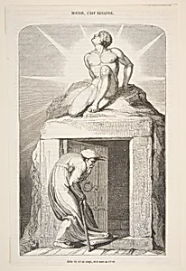*Mourir C'est Ren (Death and Immortality is a striking wood engraving from the early 19th century, as part of William Blake's visionary illustrations for Robert Blair's 1743 poem *The Grave*. Blake, pioneering Romantic artist and poet, designed this image, which captures the poem's meditation on death as a gateway to eternal life. The title, translating from French as "To Die is to be Reborn," evokes a nude male figure emerging triumphantly through grand doors—symbolizing the soul's passage from mortality to immortality. Measuring a modest plate size of 8 7/8 x 5 5/8 inches, it was produced vi...