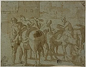 Nestled in the Art Institute of Chicago's Prints Drawings collection, *Muleteers and Mules* by Giovanni Guerra captures a lively snapshot of everyday life. Guerra, a 16th-century Italian draughtsman from Modena active in Bologna, was known for his spirited sketches of travelers, peasants, and animals, often infused with the naturalism emerging from the Carracci circle. This undated drawing likely depicts mule drivers guiding their pack animals along a rugged path—a common sight in Renaissance Italy, symbol commerce, travel, and the toil of the working class. Executed on blue-gray laid paper—a...