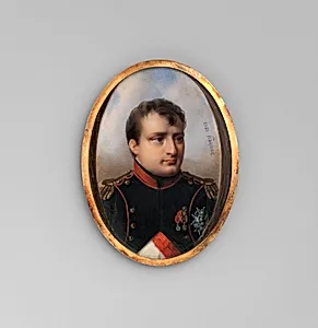 This exquisite ivory miniature portrait of Napoléon I, created by French artist Jean-Baptiste Isabey in 1812, captures the Emperor at the height of his power. Measuring just 2¼ x 1⅜ inches in an oval format, it exemplifies the intimate scale of 19th-century miniatures, designed as personal treasures to be worn as jewelry or kept in private collections. Isabey, a master miniaturist favored by Napoleon's court, rendered the likeness with remarkable precision, highlighting Napoleon's stern gaze and imperial bearing. Painted on ivory—a favored medium for its smooth, luminous surface that allowed ...