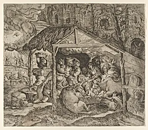 In the serene glow of this etching titled *Nativity*, created around 1543, visitors encounter a poignant scene of the Adoration of the Shepherd. Attributed to the renowned Mannerist artist Giulio Romano—pupil of Raphael and court painter to the Gonzaga dukes in Mantua—and etched by the skilled Master IQV, the print captures the humble birth of Christ amid rustic shepherds paying homage. Measuring 13 5/8 x 15 13/16 inches, its intimate scale invites close contemplation, evoking the spiritual humility central to Renaissance Nativity traditions. Etching, a relatively new technique in the 16th ce...