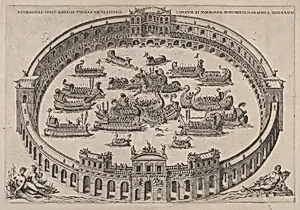 Naval engagement set inside a Roman arena, with the river Tiber and nymphs at lower left and right
