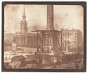 Step into the bustling heart of 1840s London with William Henry Fox Talbot's *son's Column under Construction,algar Square* (1844), a pioneering salted paper print capturing the monumental column rising amid scaffolding in the newly formed public square. Erected to honor Admiral Horatio Nelson's victory at the Battle of Trafal, the column—designed by William Railton—symbolized British naval pride during the Victorian era's architectural boom. Talbot's image, taken in the first week of April, freezes a moment of urban transformation, blending raw construction with the era's grand civic ambition...