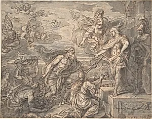 In this intricate drawing, *Neptune and Other Marine Deities Paying Homage to XIV*, attributed to Michel Corneille Younger or his father, Michel Corneille the Elder the mighty sea god Neptune leads a procession of mythical marine figures in reverence to France's Sun King. Created in the lavish era of Louis XIV's absolute monarchy (r. 1643–1715), the composition exemplifies the era's artistic flattery, portraying the monarch as a divine ruler worthy of godly adoration. Such imagery celebrated Louis's naval ambitions and grandeur, evoking the opulent decorations of Versailles or Fontainebleau. ...