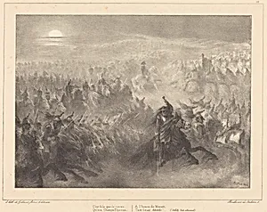 **Nocturnal Review** (1836) is a striking lithograph by French artist Auguste Raffet, a master of Romantic-era printmaking renowned for his vivid depictions of military life. Created during the Julyarchy in France, when nostalgia for Napoleon Bonaparte's era lingered, Raffet's work captures the drama and heroism of soldiers in a nighttime parade or inspection. This print exemplifies his fascination with the Napoleonic legacy, blending historical reverence with the emotional intensity of Romanticism. Lithography, the medium here, was revolutionary in the 1830s for its ability to produce intricate tonal effects and fluid lines directly from the artist's hand on stone, making detailed scenes like this accessible to a wide audience through affordable reproductions. Raffet's technique shines in rendering moonlight, shadows, and the energy of marching troops, evoking a sense of mystery and grandeur under the night sky. Housed in the National Gallery of Art's Rosenwald Collection, **Nocturnal Review** offers visitors a window into 19th-century France's cultural obsession with military glory. It's a testament to how prints democratized art, preserving epic moments for generations.