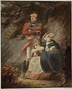 Officer Seeking Shelter with his Wife and Children from a Storm (recto); Sketch of Castle on Hill (verso)