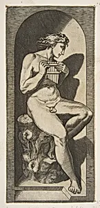 Olympus naked seated on a tree stump holding pipes, set within a niche by Marco Dente