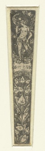 Ontwerp voor een schede. Onderste helft gedecoreerd met bladranken, bovenaan staat Mercurius blazend op een bazuin.