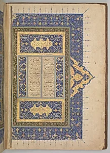 This exquisite overflap and inside cover belong to a Khamsa, or quintet of epic poems, by the renowned 12th-century Persian poetizami Ganjavi. Created in 1524–25 CE during the Saf dynasty in Persia (modern-day Iran), this artifact exemplifies the golden age of Islamic manuscript production. The Khamsa—comprising five romantic and moral tales like *Layla and Majnun*—was a cultural cornerstone, inspiring lavish illuminations that blended poetry with visual splendor for elite patrons. Crafted by a team of master artists including Sultan Muhammad Nur, Mahmud Muzahhib, and Shaikh Zada, the binding...