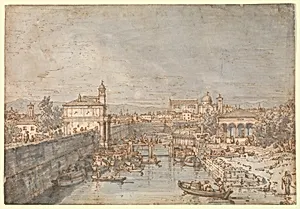 In this delicate drawing from around 1750–60, Venetian master Canaletto (Giovanni Antonio Canal, 1697–1768) captures the serene landscape Padua along the River Bacchiglione, with the historic Porta Portello gate prominently featured. Best known for his luminous vedute—precise, topographical views of Venice—Canaletto occasionally turned his eye to nearby northern Italian cities like Padua, offering visitors a glimpse into 18th-century daily life amid bridges, boats, and flowing waters. Created late in his career, this reflects his enduring fascination with architecture and urban vistas, evoking...