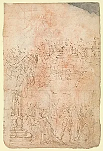 Page from a Sketchbook Depicting a City under Siege and a Scene of Homage(?) (recto); standing figures and a horseman; male and female figures; a battle scene (verso)