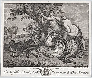 Pan picking grapes while Syrinx grabs his shoulder, with three leopards and two putti below them