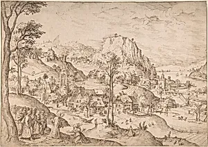 In the mid-16th century, Netherlandish artist Lucas Gassel crafted this intricate pen and brown ink drawing, *Panoramic Mountainous Estuary Landscape, with Christ and the Woman of Canaan*. Measuring just over 10 by 15 inches, it exemplifies the emerging "world landscape" style, where expansive natural vistas dominate the composition. Gassel, active in Antwerp around 1530–1560, was among the early specialists in detailed panoramic views, blending biblical narratives with meticulously rendered topography. At the heart of the scene is the New Testament episode from Matthew 15, where Christ encou...