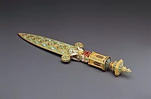 This exquisite paper knife, crafted around 1863 by the renowned goldsmith Fortunatoani in collaboration with Michelangelo Caetani Duke of Sermoneta, the opulence of 19th Italian decorative arts. Fashioned from gold and enamel, it measures an elegant 10¼ x 2¾ inches, blending functionality with artistry as a desk accessory for the elite. Castellani, a pioneer in reviving Renaissance techniques, adorned the piece with delicate angel motifs—evident in its tagged iconography—showcasing his mastery of fine granulation and cloisonné enameling, which mimicked ancient Etruscan and medieval methods. Housed in the Metropolitan Museum of Art's European Sculpture and Decorative Arts department, this metalwork object reflects Rome's vibrant revivalist movement during the Risorgimento era. Caetani, a noble patron and poet, likely commissioned it, underscoring the intersection of aristocracy and craftsmanship in unified Italy. Its gilded allure and symbolic angels evoke divine protection and scholarly pursuits, transforming a utilitarian tool into a collector's treasure. Acquired through the Mrs. Charles Wrightsman Gift in 1993, it invites visitors to appreciate how such luxury items preserved Italy's artistic heritage amid modernization.