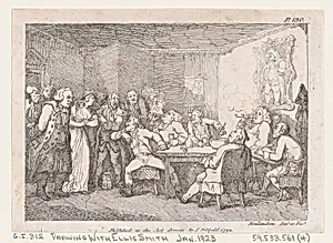 Step into the whimsical world of 18th-century English satire with this lively etching, *Parson Adams & Fanny as culprits before the Justice*, created in 1792. Drawn from Henry Fielding's novel *The Adventures of Andrews, and his friend Mr Adams*—a playful parody of sentimental fiction—the print captures a chaotic courtroom scene where the bumbling Parson Adams and virtuous Fanny face a comically inept country justice. Tags hint at the bustling details: men and women gathered amid food and pipe smoke, evoking the rowdy taverns and rustic follies of Georgian England. Renowned caricaturist Thoma...