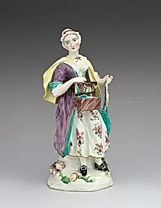 This soft-paste porcelain figure depicts a pedlar, an itinerant merchant who traveled from village to village selling small goods carried in a pack. The figure captures this familiar character from eighteenth-century British life with attention to costume and accessories, presenting the pedlar with his characteristic bundle and possibly a box of wares. The sculpture demonstrates the Derby factory's skill in modeling genre subjects that documented contemporary social types while providing decorat...