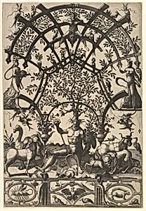 Personification of Earth, with Spade and Horn, Supporting a Tree and Lattice on His Head, A Frieze underneath from Veelderleij niewe inventien van antijckesche sepultueren diemen nou zeere ghebruijkende is met noch zeer fraeije grotissen en compertimenten zeer beqwame voer beeltsniders antijcksniders schilders en all constenaers...Libro Secundo