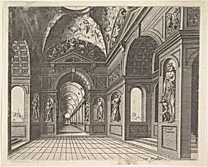 Perspective view of the interior of a hall, with cross-vault decorated with grotesques, plate 18, from Scenographiae sive Perspectivae