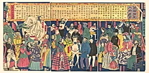 Utagawa Yoshiiku's *Picture of Men and Women from all Nations*Bankoku danjo jinsu zue), created in the 4th of 1861, is a captivating triptych of woodblock prints in ink and color on paper. of the three sheets measures 14 x 9¾ inches, forming a panoramic composition typical of ukiyo-e, the vibrant "pictures of the floating" genre from Japan's Edo period (16151868). Yoshiiku, a prolific artist from the renowned Utagawa school, known for his dynamic depictions of contemporary life, actors, and warriors, blending meticulous line work with bold colors achieved through the collaborative woodblock pr...