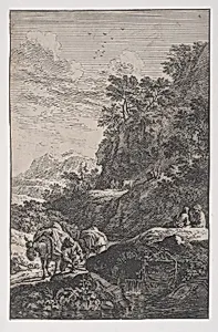 Plate 1: a peasant checking the hoof of his mule by a stream, from 'Landscapes in the manner of Salvator Rosa' (Die Landschaften in Sal. Rosa's)