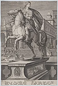 Plate 12: equestrian statue of Domitian, seen three-quarters to the left, with his stabbing death at right in the background, from 'Roman Emperors on Horseback'