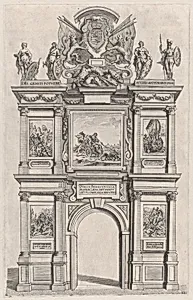 Plate 12: Triumphal arch, elevation of the back facade, surmounted with the arms of Ferdinand and decorated with five mythical or heroic scenes; from Guillielmus Becanus's 'Serenissimi Principis Ferdinandi, Hispaniarum Infantis...'