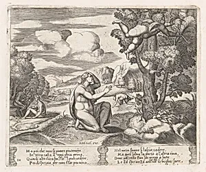 Plate 14: Psyche kneeling in the foreground as Cupid flees from her, from "The Story of Cupid and Psyche as told by Apuleius"