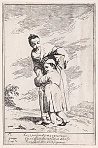 Plate 16: Menghina quiets Cacasenno with a chestnut cake, from "Bertoldo, Bertoldino, and Cacasenno"