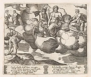 Plate 18: Venus in her dove-drawn chariot complaining to Jupiter, who is accompanied by Mercury and an eagle, at left Mercury has descended to earth, from "The Story of Cupid and Psyche as told by Apuleius"